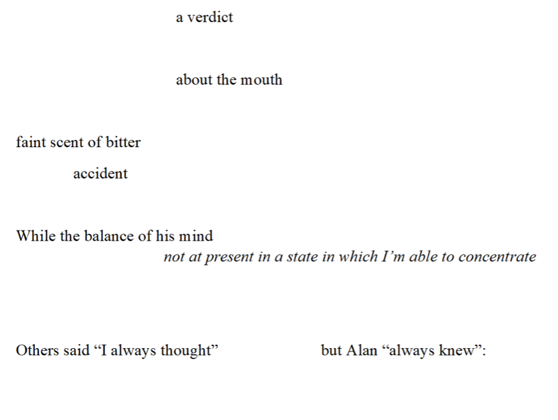 A “bitter// accident” indeed. Blank space intervenes, as, perhaps, she muses that her son’s mind was in a perilous “balance,” declared in the italicized sentence, from a 1952 letter to his friend and fellow mathematician Norman Routledge, in which Turing lays out what he’s about to be convicted of, signing off with “Yours in distress, Alan.” (Not quoted here, but if you know the letter, as Sara does, it hurts more. The letter becomes the subject of a later poem.)